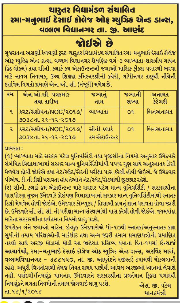 Charutar Vidyamandal Recruitment for Lecturer & Senior Clerk cum Accountant Posts 2018