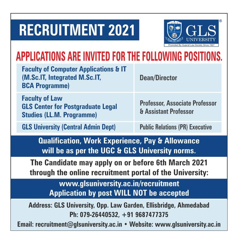 GLS University Recruitment for Various Posts 2021