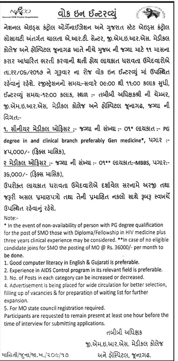 GMERS Medical College and Hospital, Junagadh Recruitment for MO & SMO Posts 2017