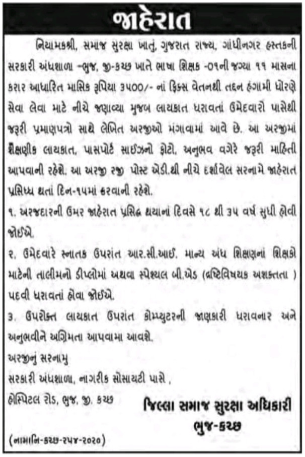 Government Blind School, Bhuj-Kutch Recruitment for Language Teacher Post 2020