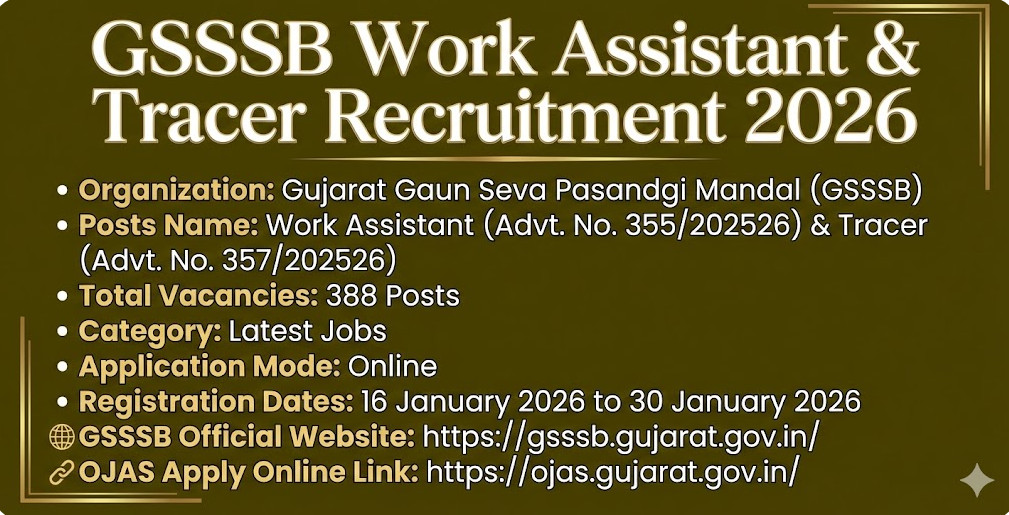 Gujarat Gaun Seva Pasandgi Mandal (GSSSB) Work Assistant & Tracer Recruitment 2026 Apply Online for 388 Posts