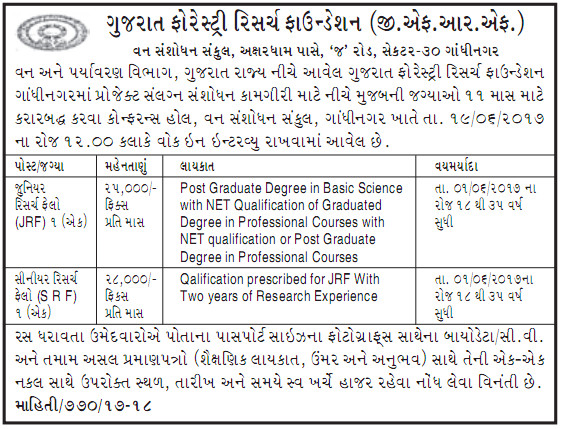 Gujarat Forestry Research Foundation (GFRF) Recruitment for JRF & SRF Posts 2017