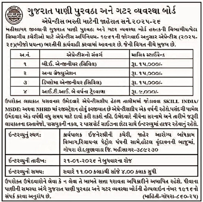 Gujarat Water Supply and Sewerage Board (GWSSB) Mahisagar Apprentice Recruitment 2026