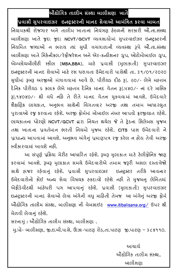 ITI Balisana (Patan) Recruitment for Pravasi Supervisor Instructor Posts 2020