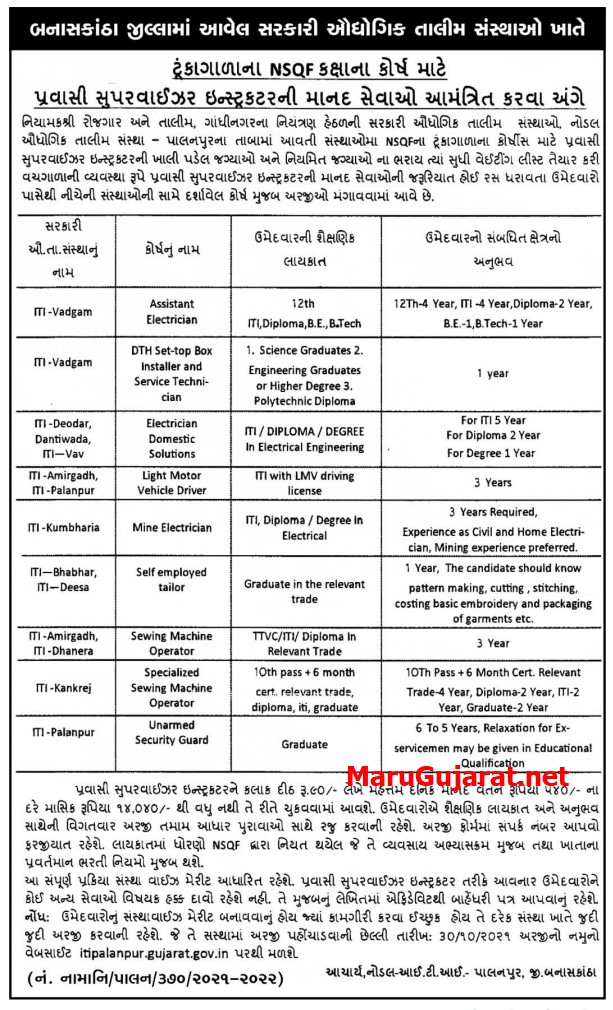 Industrial Training Institute (ITI) Banaskantha Recruitment for Pravasi Supervisor Instructor Posts 2021