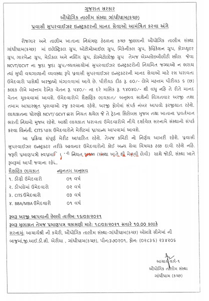 Industrial training institute (ITI) Gandhidham (Kutch) Recruitment for Pravasi Supervisor Instructor Posts 2021