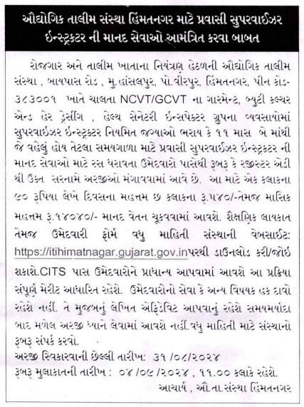 Industrial training institute (ITI) Himatnagar Recruitment for Supervisor Instructor Posts 2024