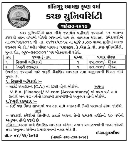 KSKV Kachchh University Recruitment for Account Officer & Deputy Registrar Posts 2019