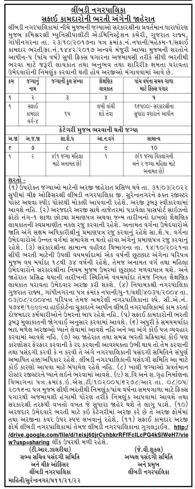 Limbdi Nagarpalika Recruitment for Safai Kamdar Posts 2022