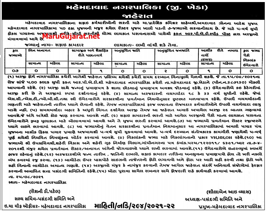 Mahemdavad Nagarpalika Recruitment for Safai Kamdar Posts 2021