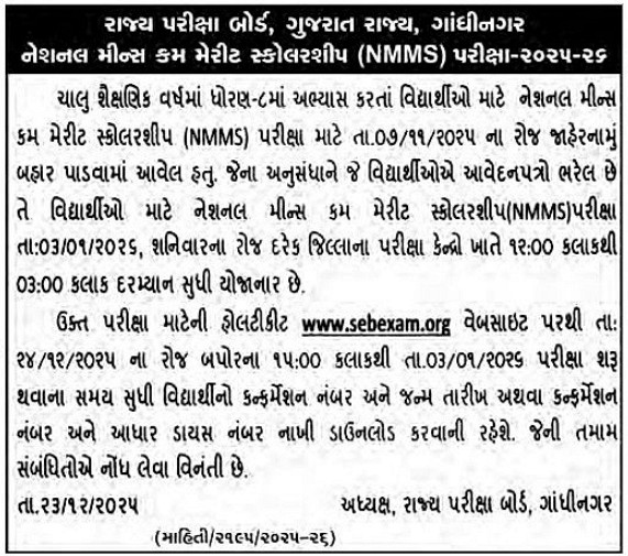 • Exam Name: National Means Cum Merit Scholarship (NMMS) 2025-26