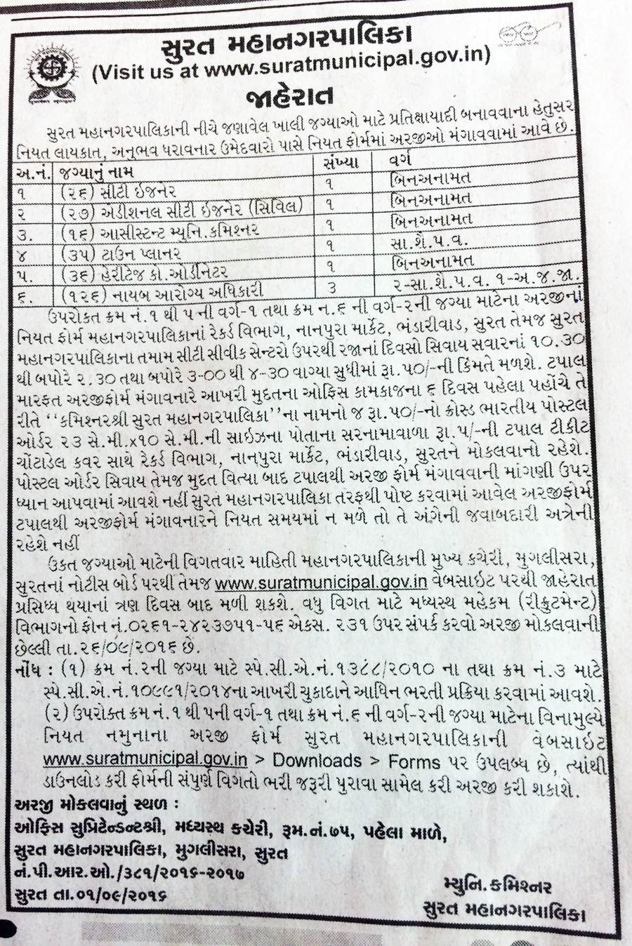 Address: Office Superintendent, Central Office, Room No. 75, First Floor, Surat Municipal Corporation, Muglisara, Surat.